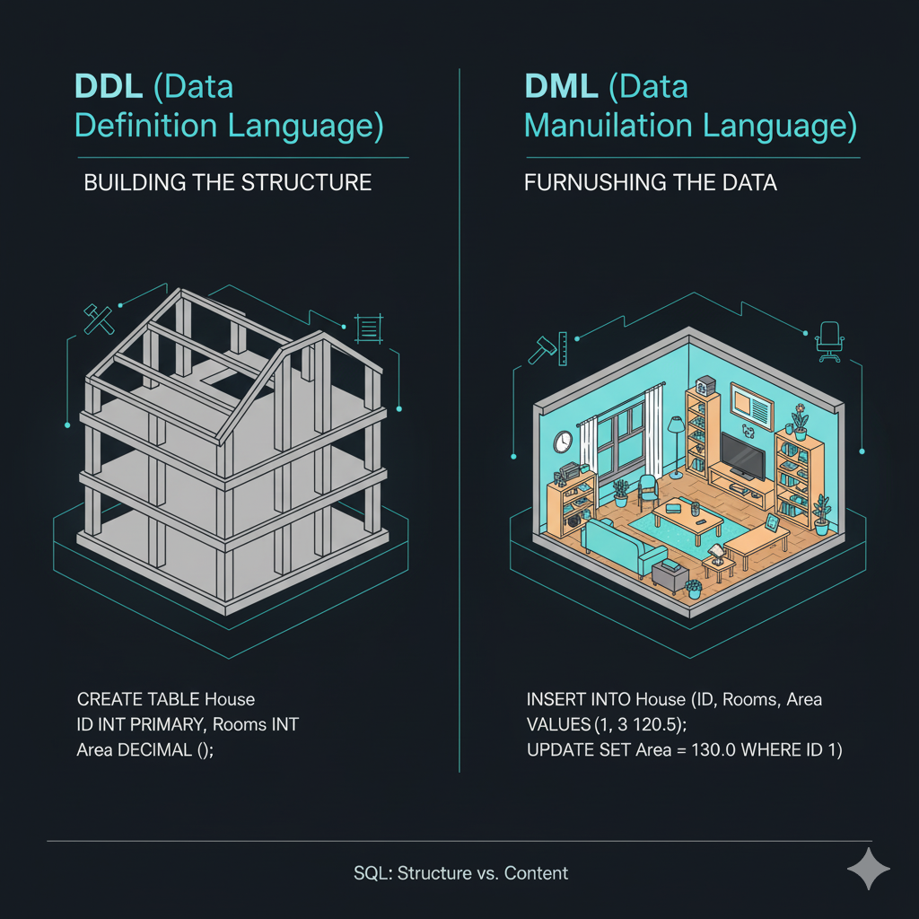 );Có thể hình dung: nếu DML (INSERT, UPDATE, DELETE) là thay đổi dữ liệu bên trong, thì DDL là thay đổi khung, tức là cấu trúc của căn nhà.